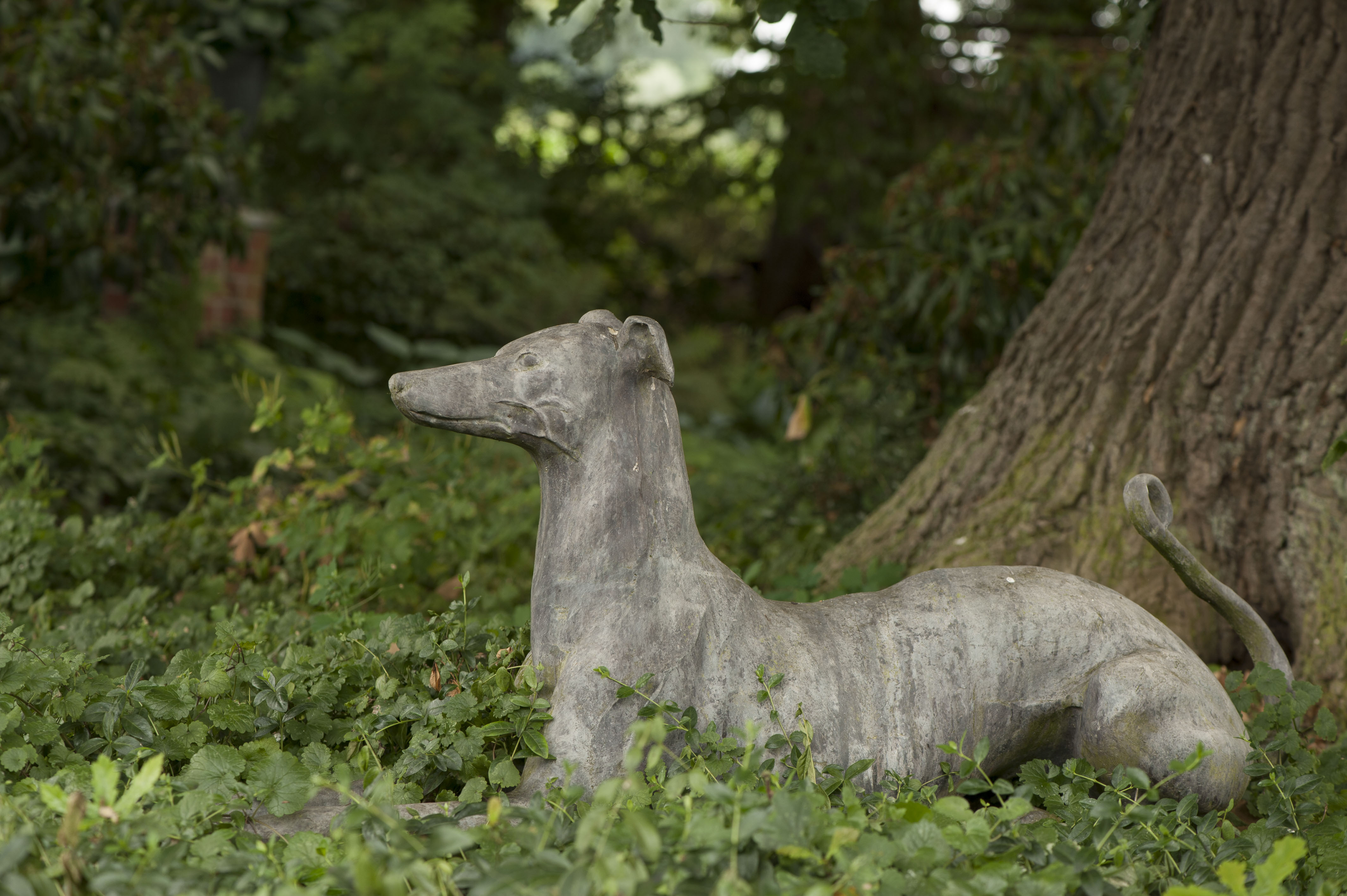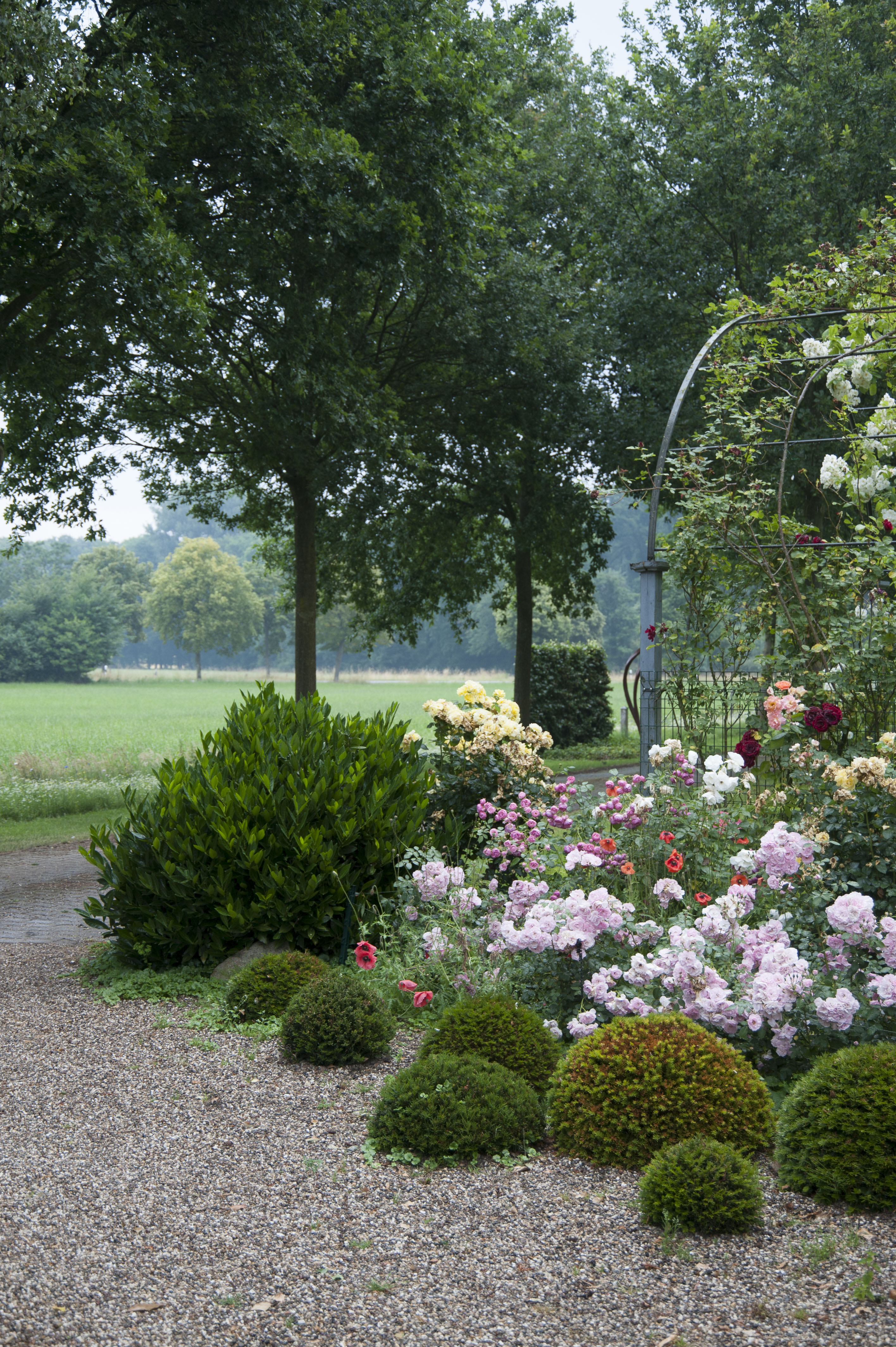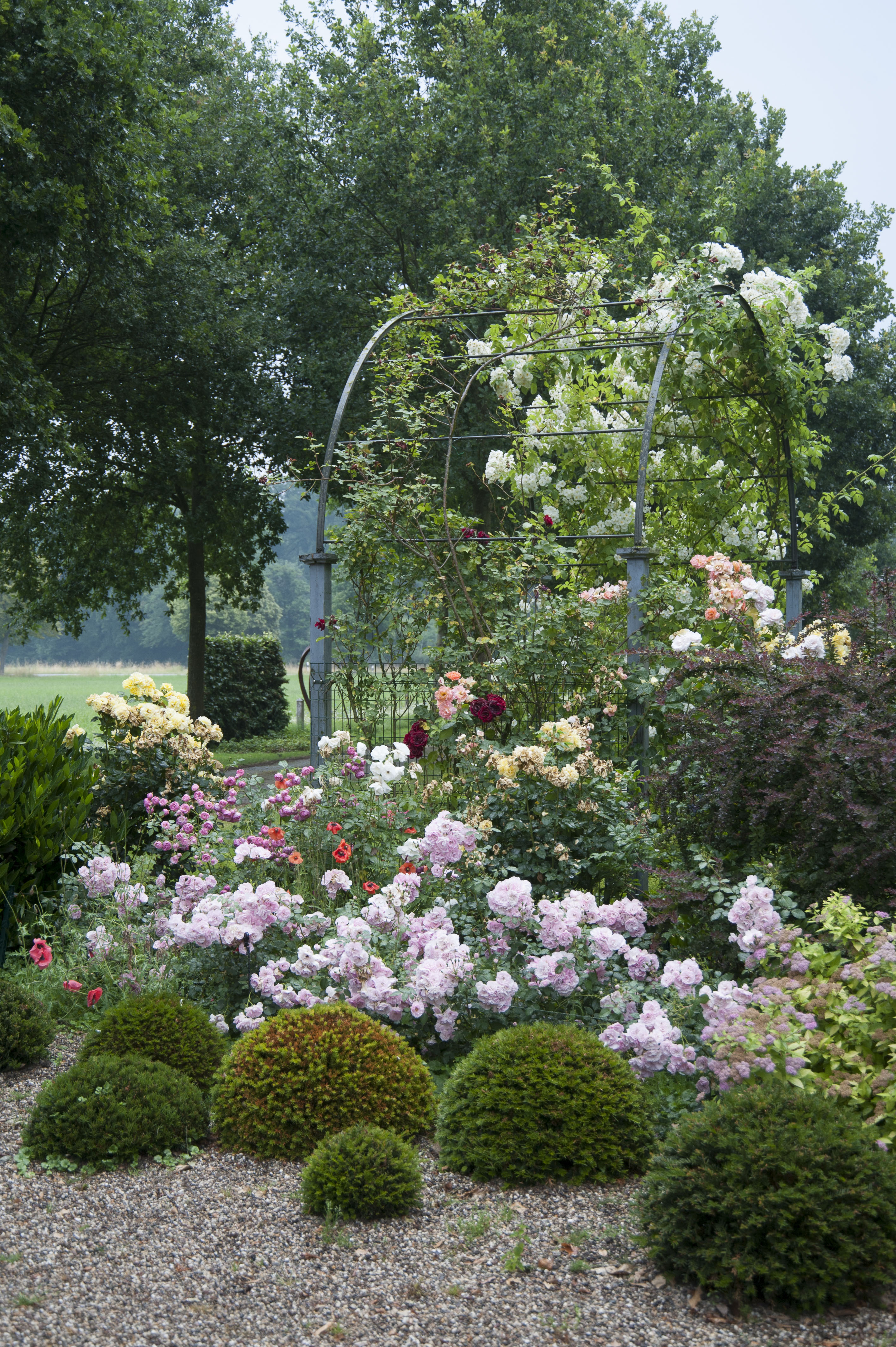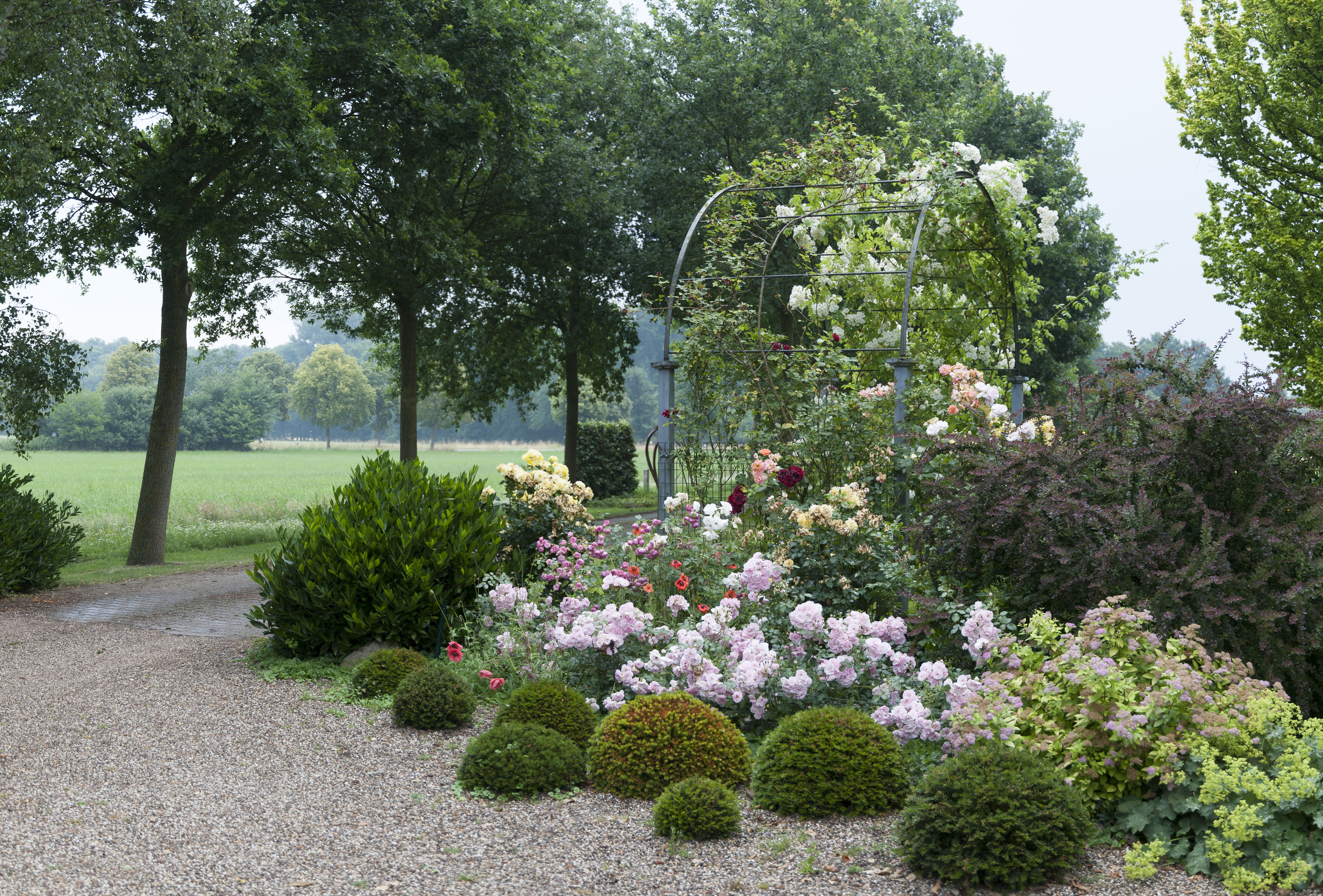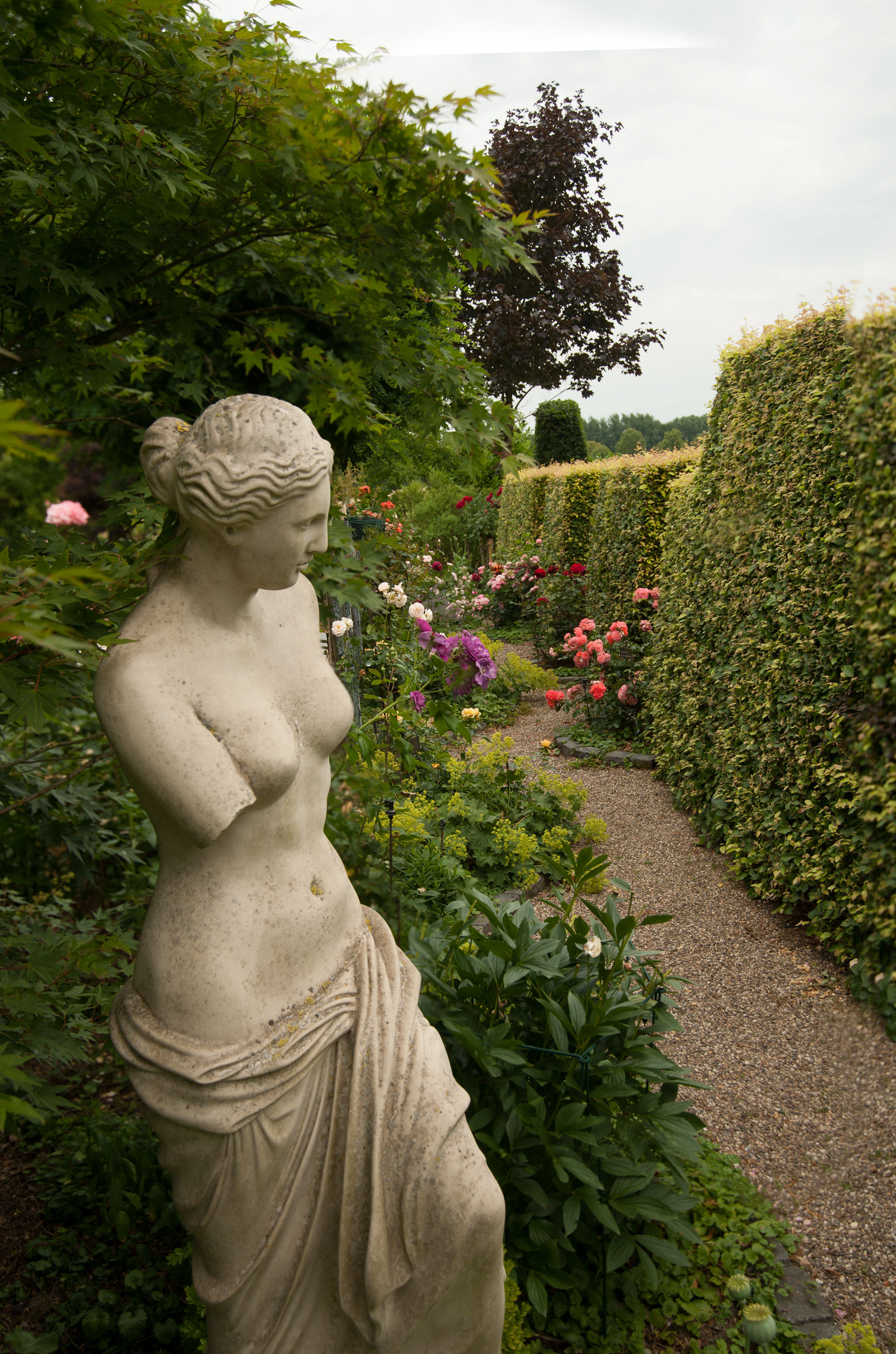 IDie 100 m Zuwegung zu diesem Wäldchen, war mal eine Ackerzufahrt . Heute ist es ein Rasenweg, der links und rechts von alten Rosensorten von David-Ausin aus England gesäumt ist. Bei einem Besuch auf der Insel Mainau hatte ich diese übermanshohen Rosenbüsche gesehen.ch war so begeistert, dass ich das in meinem Garten auch haben wollte und mir die Sträucher aus England habe schicken lassen. Natürlich durften auch Kunstwerke nicht fehlen. Etliche Statuen, Büsten sowie Gartenornamente aus englischem Bleikunstguss, Terrakotta, Guss oder Haddonstone sind im Garten positioniert. So ist in 25 Jahren ein vielgestaltiger Garten entstanden. Er wird mit viel Liebe und Mühe von mir gepflegt. Seit einigen Jahren ist unser Garten im Rahmen der "Borkener Gartentage" geöffnet. Auf Absprache können auch Besuchergruppen den Garten besichtigen.